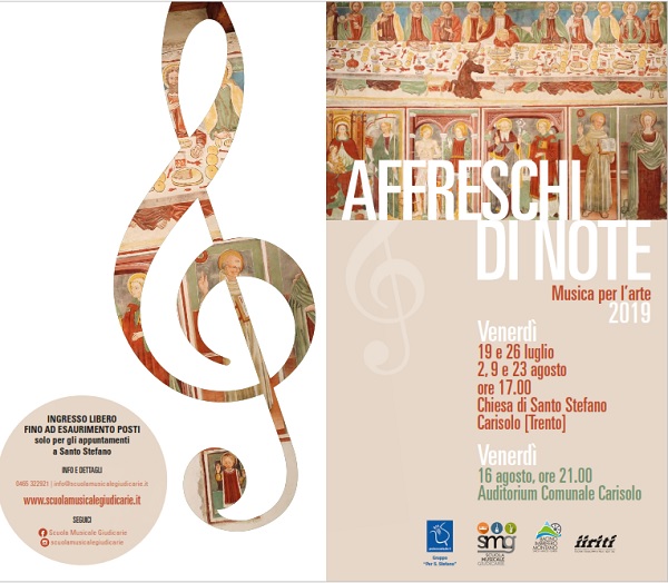 Proseguendo l’itinerario intrapreso lo scorso anno con la rassegna musicale “Affreschi di Note / musica per l’arte”, la Scuola Musicale Giudicarie, in collaborazione con il Gruppo “per Santo Stefano” e la Pro Loco di Carisolo, propongono per l’estate 2019 una nuova stagione concertistica nella Chiesa di Santo Stefano a Carisolo. Musica e arte si incontrano, nei pomeriggi estivi, presso la Chiesa di Santo Stefano, situata all’imbocco della Val di Genova, in un luogo di incomparabile bellezza. La Chiesa, celebre per gli affreschi di Simone Baschenis, offre una suggestiva cornice ad una programmazione concertistica che spazia dai capolavori del repertorio cameristico classico e romantico a quello operistico, dalla musica antica all’avvincente musica da film.