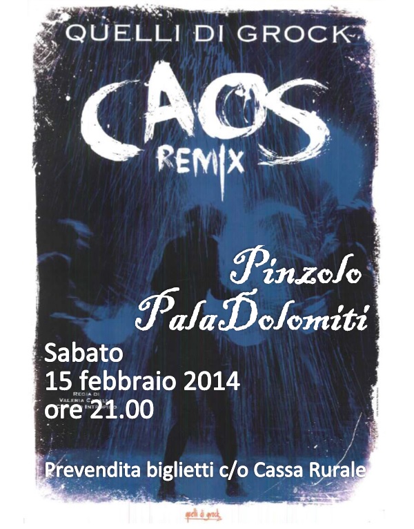 Nell’ambito della stagione di Prosa 2013/2014 viene proposto presso il Teatro Paladolomiti di Pinzolo lo spettacolo “Caos Remix”. L’appuntamento è per sabato 15 febbraio alle ore 21.00 con la compagnia “Quelli di Grock”. Fondata a Milano da allievi del Piccolo Teatro del calibro di Maurizio Nichetti e Angela Finocchiaro, la compagnia ha portato in tournée negli anni ’90 lo spettacolo “Caos” presentandolo con grande successo nei teatri dei più importanti festival europei.