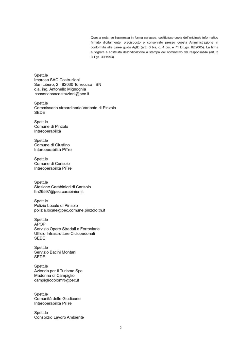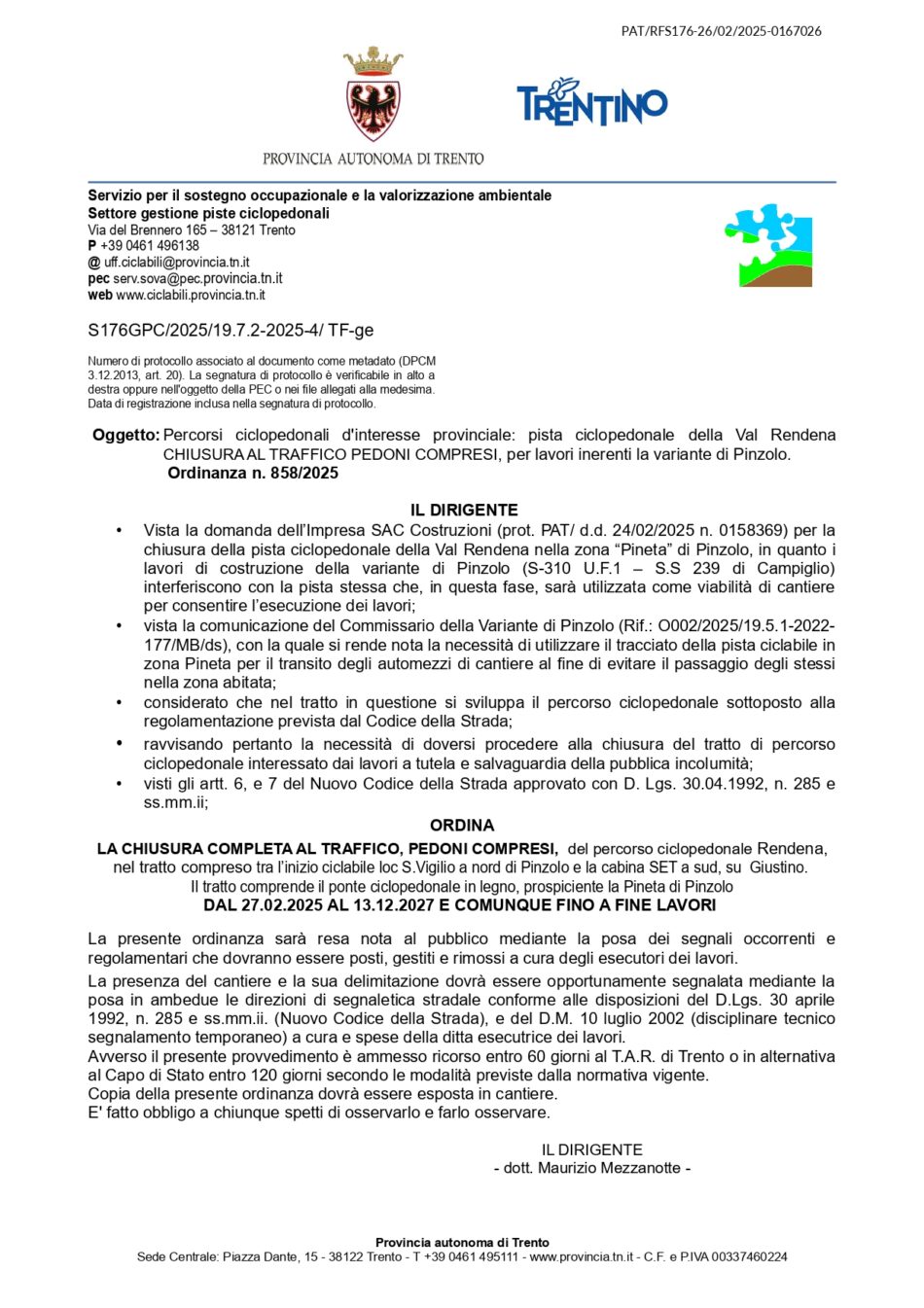 “Percorsi ciclopedonali d’interesse provinciale: pista ciclopedonale della Val Rendena CHIUSURA AL TRAFFICO PEDONI COMPRESI, per lavori inerenti la variante di Pinzolo”